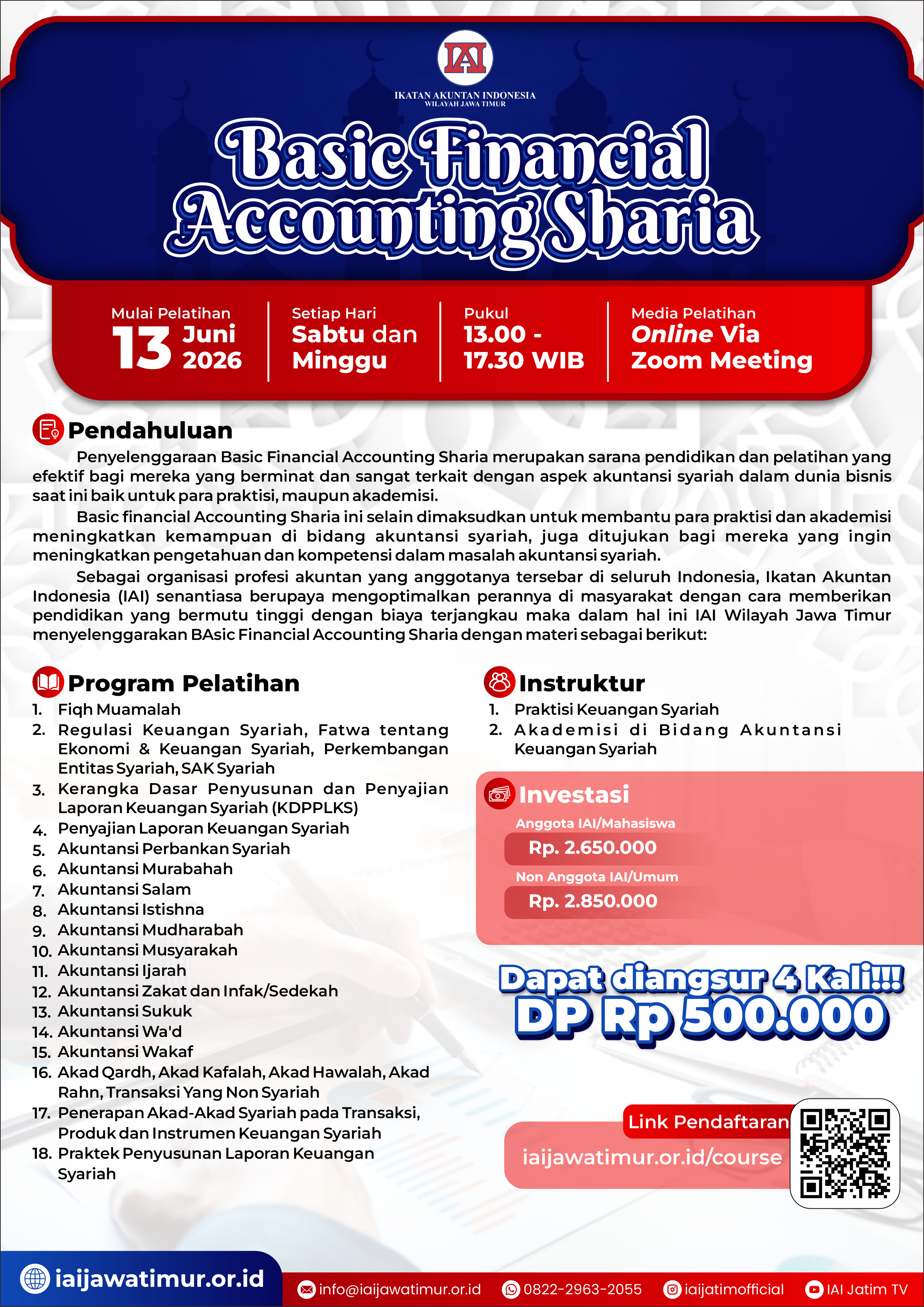 Dirancang oleh Ikatan Akuntan Indonesia Wilayah Jawa Timur untuk membekali peserta dengan pemahaman menyeluruh mengenai dasar-dasar akuntansi keuangan berbasis prinsip syariah.